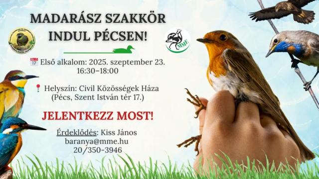 Az MME Baranya Megyei Csoport 2025.09.23-án kedden 16.30-18.00 között a Civil Közösségek Házában (Pécs, Szent István tér 17.) madarász szakkört indít olyan 12-18 év közötti fiataloknak, akik szeretnék megismerni a madarakat és a jövőben részt szeretnének venni a helyi csoport munkájában. A szakkör terveink szerint havi 2 alkalommal keddi napokon 16.30-18.00 között elméleti oktatással és havonta vagy kéthavonta 1-1 terepi nappal fog működni iskola időben. A cél olyan megbízható fajismerettel rendelkező fiatal utánpótlás kinevelése, akik önállóan tudnak majd feladatokat elvégezni (pl. fecske számlálás, téli madárles, KFO felmérés stb.). A részvétel ingyenes, de túljelentkezés esetén fenntartjuk a jogot a résztvevők kiválasztására. További információ Kiss János irodavezetőnél (20/350-3946, baranyaatmme [dot] hu).